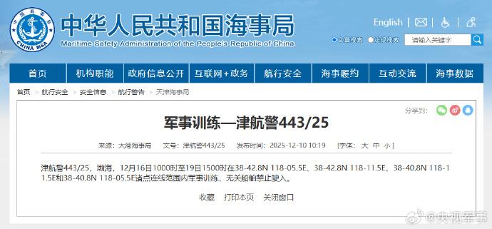 据中国海事局网站音问,大港海事局发布飘扬警告,12月16日10时至19日15时,渤海部分海域进行军事覆按,无关船舶辞谢驶入。