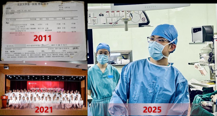 邓睿逸与北大医学的因缘,始于14年前一张发黄的处方。2011年,10岁的他因合手续高烧来到北大病院儿科。恰是大夫们精确的会诊让他手到病除,被督察的和煦在他心中种下了一颗医学的种子。10年后,这颗种子在“水准原点”破土而出,邓睿逸动作北大病院的医学生认真穿上白大衣。如今,他已成为又名北大病院的外科学(泌尿外)博士斟酌生、外科入院医师,参与多例高难度手术与疑难患者围术期全程管理,累计管理疑难危重患者30余东说念主,协助完成10余台高难度手术,取得多封患者感谢信与锦旗。所管理的2例疑难患者,其诊疗奇迹获病院官微“金牌团队”专栏报说念。他协助导师龚侃教师开展精确诊疗门诊,开出宇宙首张VHL详细征靶向药处方,为荒原病患者大开人命通说念。