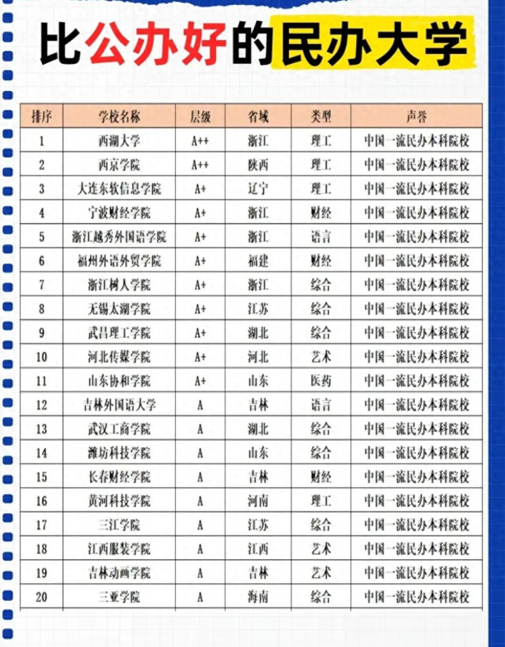 又到一年升学季,家长和考生的案头,除了堆积如山的志愿填报指南,多样大学名次榜单也纷繁登场。最近,一张对于“比公办好的民办大学”榜单流传开来,西湖大学、西京学院、大连东软信息学院等二十所民办高校位列其中,并被冠以“中国一流民办本科院校”的声誉评级。