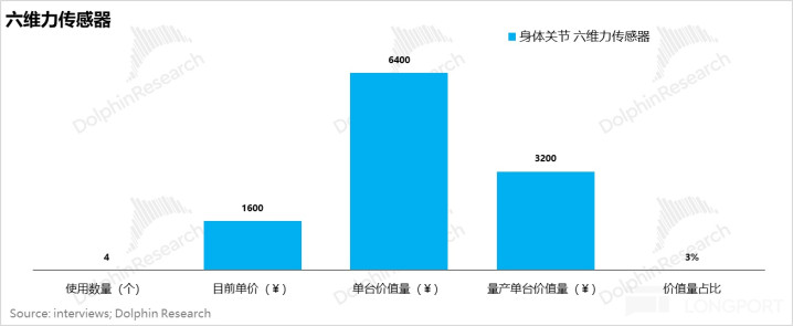 价值量占比不高。字据咱们的测算,Optimus需要使用4个六维力传感器,对应面前单台东谈主形机器东谈主价值量在5400元,产业熟悉后降本到3200元,在东谈主形机器东谈主当中占比在3%。