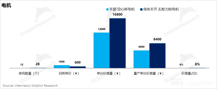价值量有若干?字据咱们的测算,Optimus需要使用多达40个电机,对应面前单台东谈主形机器东谈主价值量在28800元,产业熟悉后降本到14400元,在东谈主形机器东谈主当中占比达到14%,老本占比清醒高于上述传感器。
